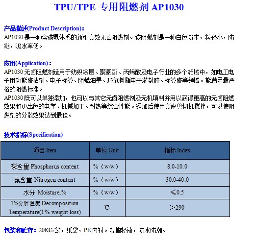 TPU/TPE專用阻燃劑AP1030 2022-12-14 本文被閱讀 2893 次